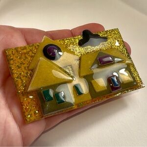 Vintage Lucinda signed house pin featuring a charming glitter resin town scene with dimensional 3D details and vibrant inset accents. Larger size than many Lucinda houses, making it a great statement brooch for jackets, scarves, bags, or collectors of vintage artisan jewelry.