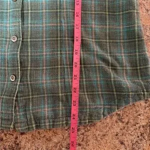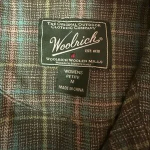 Stylish Woolrich flannel with a green and brown plaid pattern. Medium petite.