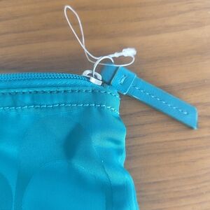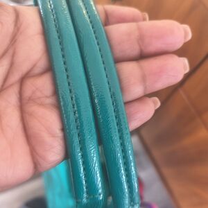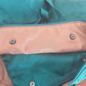 Stylish Coach tote bag in vibrant green with a chic pink scarf accent. Perfect for adding a pop of color to any outfit. Comes with detachable pouch and is in good condition with no holes, rips or smells.