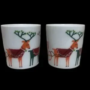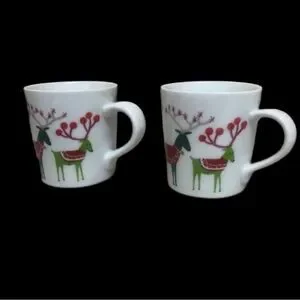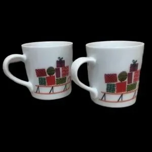 Set of 2 very festive mugs. White background with reindeer, sleigh and presents. Super cute.