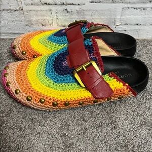 Pre ownes Kurt Geiger London Ozark rainbow crochet mules, size 40.