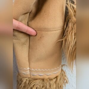 Stylish tan leather jacket. Features faux fur trim. Perfect for a chic look.