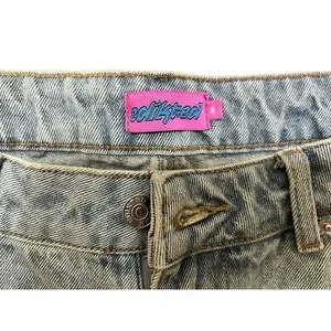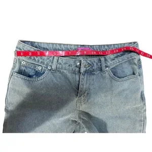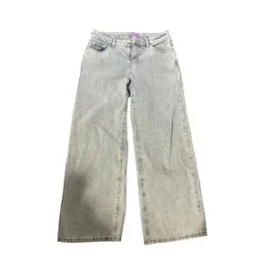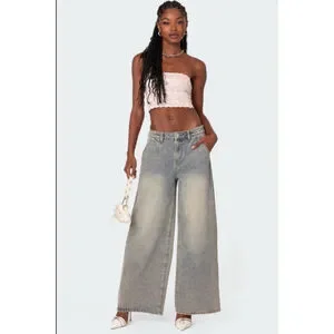 These Edikted wide-leg jeans are a light wash blue denim, featuring a five-pocket design with a button and zipper closure. The fabric exhibits an intentionally faded and distressed appearance, particularly on the thighs. Visible measurements suggest an approximate 29-30 inch waist, a 10-11 inch rise, and a 30-31 inch inseam. The brand tag displays 'Edikted' and size 'M'. The jeans appear in good pre-owned condition, showing typical wear consistent with their style, with no major visible flaws.