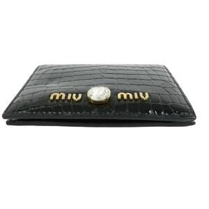 Authentic MIU MIU embossed patent leather bi-fold compact wallet in classic black. This elegant wallet features a sleek, glossy patent finish with embossed detailing, offering a timeless and sophisticated look. Designed for everyday functionality in a compact silhouette, it easily fits into small handbags while keeping essentials organized.