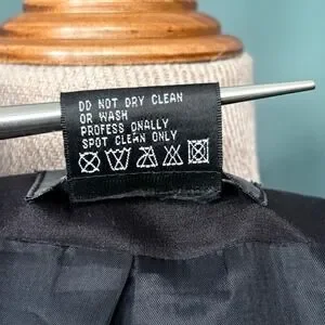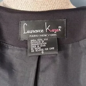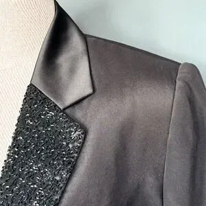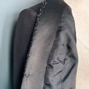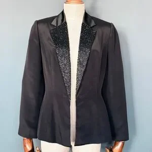 Offered is a women's Laurence Kazar blazer crafted from 100% silk with a high-shine finish. This elegant black evening jacket features black beaded embellishment along the lapel, giving it a refined, formal look ideal for special occasions or New Year's Eve styling.