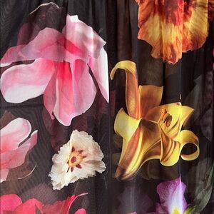 black ribbed jersey bodice dress with drawstring tie front open at front to a maxi length tiered vibrant large floral pattern lined skirt. Perfect for spring and summer, beach, pool side lounge dress