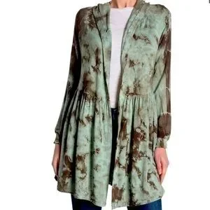 An open front cardigan features a tie dye or soild print for trendy flair.