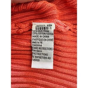 This beautiful coral-colored, cable-knit sweater is crafted from a luxurious silk and cotton blend, making it perfect for warm weather.