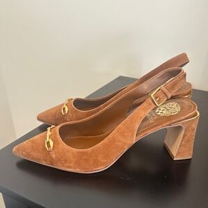 Elegant brown suede heels with slingback design. Features gold accents for a chic look. These are new and never worn. However they do not come with a box. Size 10, color is listed as Brown Sugar.