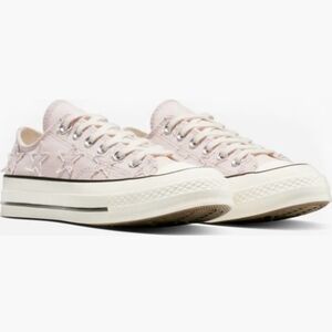 Elevate your footwear collection with these Converse Chuck 70 Celestial Low sneakers in the sought-after Shy Flamingo pink, originally purchased from Free People. These premium sneakers feature a unique tonal embroidered star design across the canvas upper, offering a whimsical and cosmic touch to the classic silhouette. Crafted with the signature Chuck 70 high-gloss egret midsole, black foxing stripe, and vintage-style stitching, they provide a sophisticated, retro look. Complete with plush OrthoLite cushioning for all-day comfort and durable organic canvas, these stylish lows perfectly bridge the gap between bohemian flair and classic streetwear.