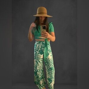 Enhance your wardrobe with these sophisticated green leaf print wide-leg pants, designed for a relaxed yet chic fit. Cropped top included