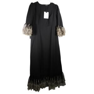 This magnificent maxi has all the glam touches you could want — shirring at the shoulders to create a slight puff, flattering princess seams, and gold embroidered lace at the sleeves and skirt hem for a vintage-inspired feel. A look suited for events and occasions, this elegant and elevated silhouette pairs well with heels, a clutch, and a glass of bubbly!