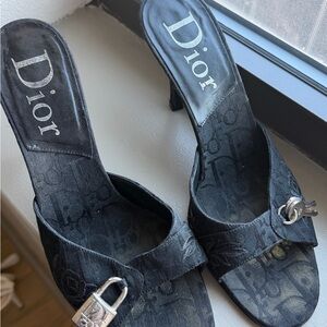 These are vintage Christian Dior monogram heels featuring a padlock charm on the front strap. Floral detailing on the sides. Size 41 (or more closely a size 10)