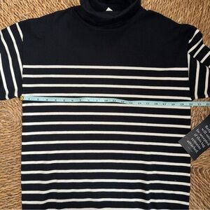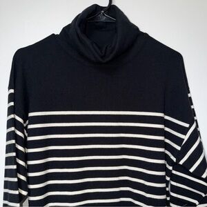 Stay cozy and stylish in our Pomander Place Black Striped Durand Turtleneck Mini Dress. This relaxed fit dress features a playful stripe motif, three-quarter length sleeves, and a mini length for a flirty touch. Made with a soft and durable blend of materials, this dress is perfect for any occasion.