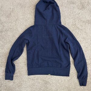 Navy hoodie with bold stripes in red, orange, and blue. Features a front zipper and hood.