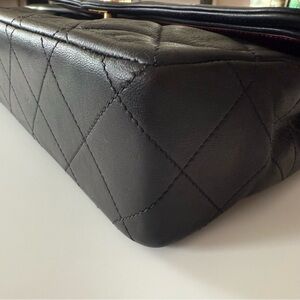 CHANEL Paris double flap shoulder bag in black quilted design. Features classic gold plated chain link with two tone interlocking CC and turn lock closure. Single interior pocket. Four internal pockets.