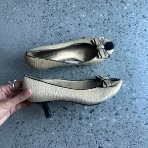 Naturalizer Women 7.5 Heels Gold Tan Peep Toe Kitten Heels Gold Woven Bow Accent Y2K Vintage