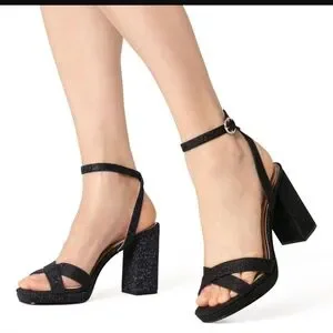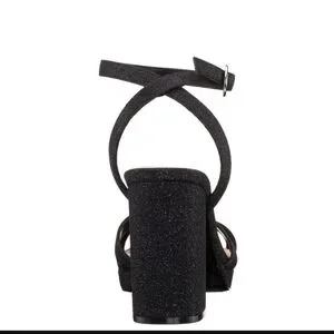 Chic black sandals with glitter net block heels. Features an ankle strap for secure fit. Ideal for stylish outings.