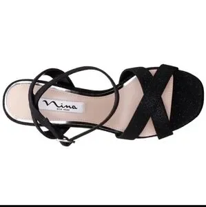 NWT Nina "SHELIA" Black Glitter Chunky Heel Sandal 8.5 Glamorous Whimsy Vamp