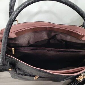 Black Faux Leather Tote Satchel Crossbody Purse Pink Trim w/ Pom Pom Charm Twill