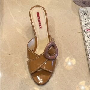 Elegant Prada mules in glossy brown patent leather. Features a stylish buckle accent. Ideal for chic outings.