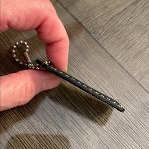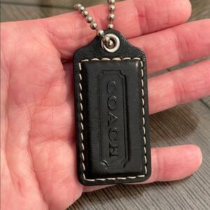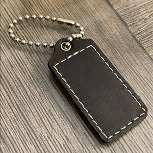 Sleek black leather key holder by Coach. Features durable stitching and a metal chain. Ideal for organizing keys with style.
