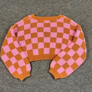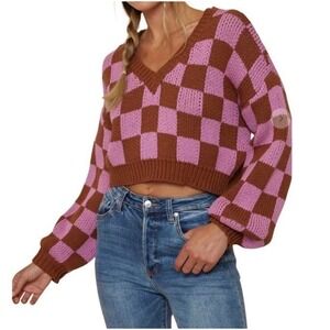 Vestique Pink Brown Checkered Cropped Chunky Preppy V-Neck Knit Sweater Womens M