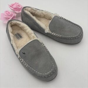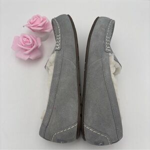 Elegant gray moccasins with cozy lining. Perfect for casual comfort.