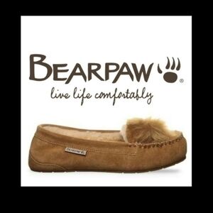 These fun, stylish suede slippers have a faux fur collar and fluffy pom pom.