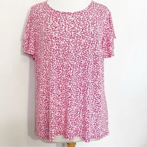 Adrianna Papell Ruffle Tiered Short Sleeve Pink Floral Slinky Knit Top. Size 1X. Chic pink floral top with short sleeves. Ideal for casual wear. Soft and stylish.