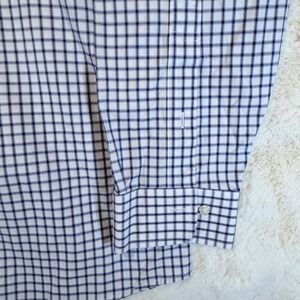 Brooks Brothers button-down shirt crafted from a high-quality Supima cotton blend with a hint of spandex for comfortable stretch. This non-iron dress shirt features a classic navy and white check pattern, a traditional pointed collar, and a single chest pocket. Designed with a curved hem and adjustable button cuffs, it offers a polished look suitable for professional or business-casual wear. The fabric is specifically engineered to resist wrinkles, maintaining a crisp appearance throughout the day.