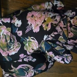 Embrace elegance with this stunning floral V-neck dress. Featuring a beautiful black and pink color palette, this dress is perfect for any occasion. The ruffle details add a touch of femininity. Drape front and back. Side slit. Gorgeous dress, pictures do not do this justice. wore 1x, a couple hours.