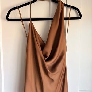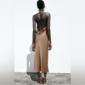 Chic Zara maxi dress in smooth satin. Features a stylish halter neckline. Ideal for special events.