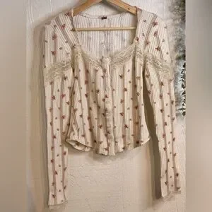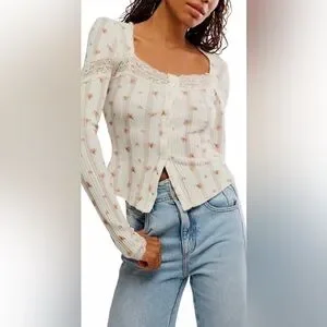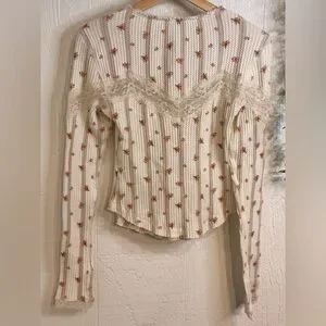 Semi-sheer lace inset at front and back yokes, sleeves, and cuffs