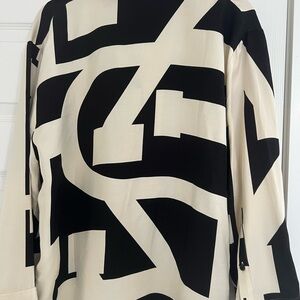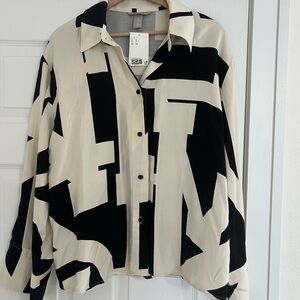 Stylish blouse with bold geometric pattern. Button-up front. Long sleeves. Perfect for a chic look.