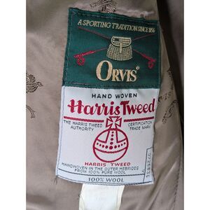 Vintage Orvis Harris Tweed blazer tailored in England from certified Harris Tweed handwoven in the Outer Hebrides of Scotland. Features the official Harris Tweed Orb certification label and interior “Made in England” tag, placing this piece in Orvis’s higher-end late 1980s–early 1990s heritage production era.