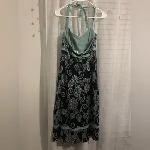 This gorgeous LOFT dress features a navy base with an intricate floral and swirl print in soft mint and beige tones. The mint trim details highlight the bust and hem beautifully, while the halter neckline ties in the back for a flattering, adjustable fit. Side zipper closure and light lining for comfort and shape.