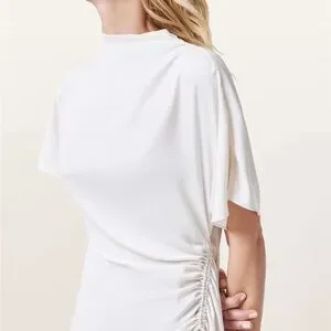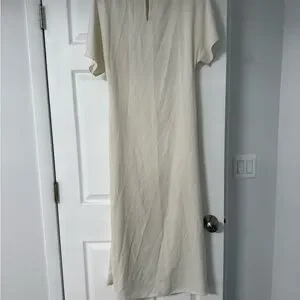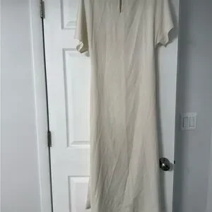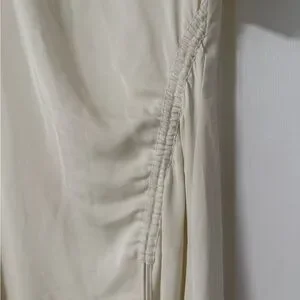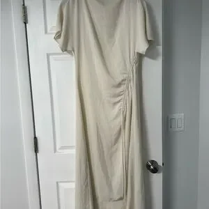 Stylish cream midi dress with elegant draping. Ideal for versatile wear.