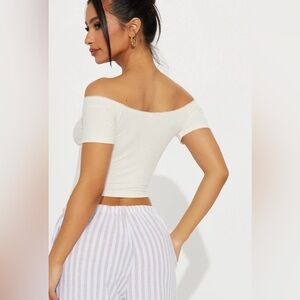 Elevate your style with this chic off-shoulder white ribbed top. Perfect for any occasion, it offers a flattering fit and timeless elegance.