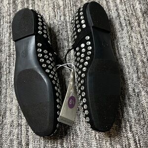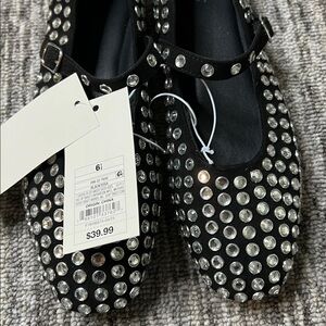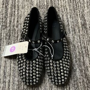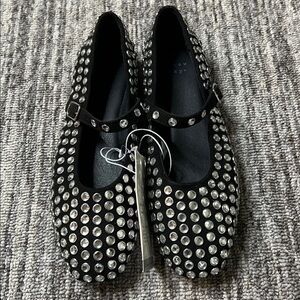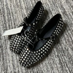 Stylish black Mary Jane flats adorned with eye-catching silver studs. Perfect for adding a touch of glamour to any outfit.
