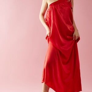 Stunning red/orange one-shoulder, silky, free flowing maxi dress. Perfect for formal events but can be styled casually aswell.