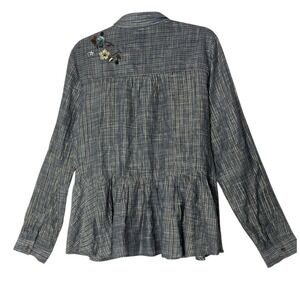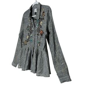 The Anthropologie x HD in Paris Top is a stylish and versatile women's shirt in size Large. This long sleeve button-up top features a striped pattern with embroidered sequin accents, adding a touch of bohemian, metal, and Parisian flair. Made from a comfortable blend of cotton and polyester, this relaxed fit tunic is perfect for casual occasions in all seasons. With its oversized design and unique details, this shirt is a must-have addition to any fashion-forward wardrobe.