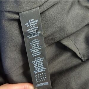 The White House Black Market Women Black Lace Floral Formal Cocktail Dress in size 8 is a stylish and elegant option for various formal occasions. This sleeveless dress features a round neckline and a button closure, with accents of black lace floral patterns adding a touch of sophistication. Made from polyester satin fabric, it has a knee-length fit and flare style that is perfect for events like weddings, parties, or even a night out in the city. The dress is lined and has pockets for added convenience, making it a versatile and chic addition to any wardrobe.