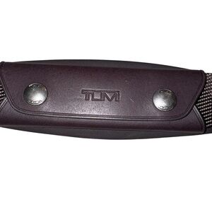 Sophisticated Tumi messenger bag in blue. Features durable brown straps and multiple compartments. Ideal for business or travel.