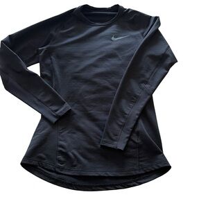 Sleek and versatile long sleeve tee. Ideal for activewear. Is tailored to flatter waist with scalloped bottom hem. Features Nike logo on chest.