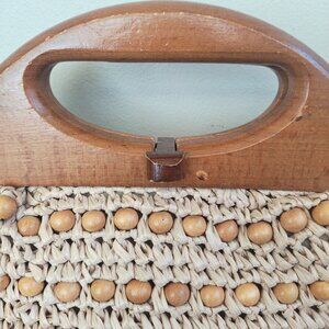 Vintage wood-beaded handbag, likely from the 1960s or 1970s. The bag is characterized by a cream or beige woven body accented with rows of round wooden beads and a solid wooden top handle.