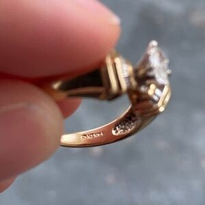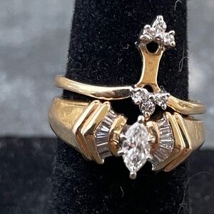 This is a pair of 14k gold, diamond stacking/puzzle rings. Stacked together the ring stack is between size 4 and 4.5. I have taken and listed photos of the two rings both stacked together and what they look like apart.