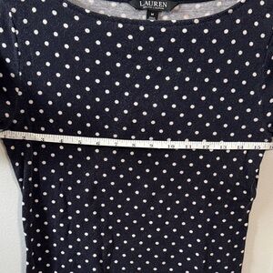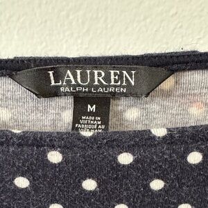 Ralph Lauren chic, navy polka dot top. Perfect for any occasion, this stylish piece offers both comfort and elegance. Item has been worn but in great condition!
