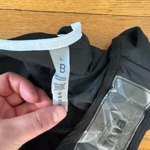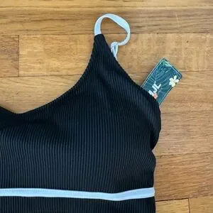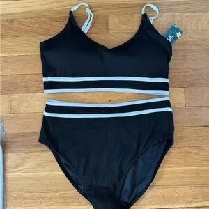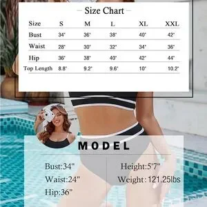 This Amazon bikini set features a sporty design with a classic black and white color scheme. The scoop neck top and high-waisted bottoms are accented with white stripes, offering a clean and athletic look. Perfect for a stylish day at the beach or pool.