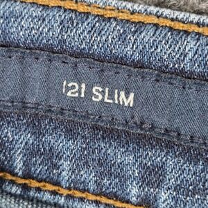 Lucky Brand 121 Slim jeans offer a classic aesthetic with a medium wash and intentional fading through the thighs and seat. These denim pants feature a traditional five-pocket design, a zip fly with button closure, and the signature leather brand patch at the back waistband. The fabric provides a slight stretch for comfort, while the slim fit creates a modern, tailored silhouette. Frayed detailing at the leg openings adds a subtle lived-in character to the overall look.